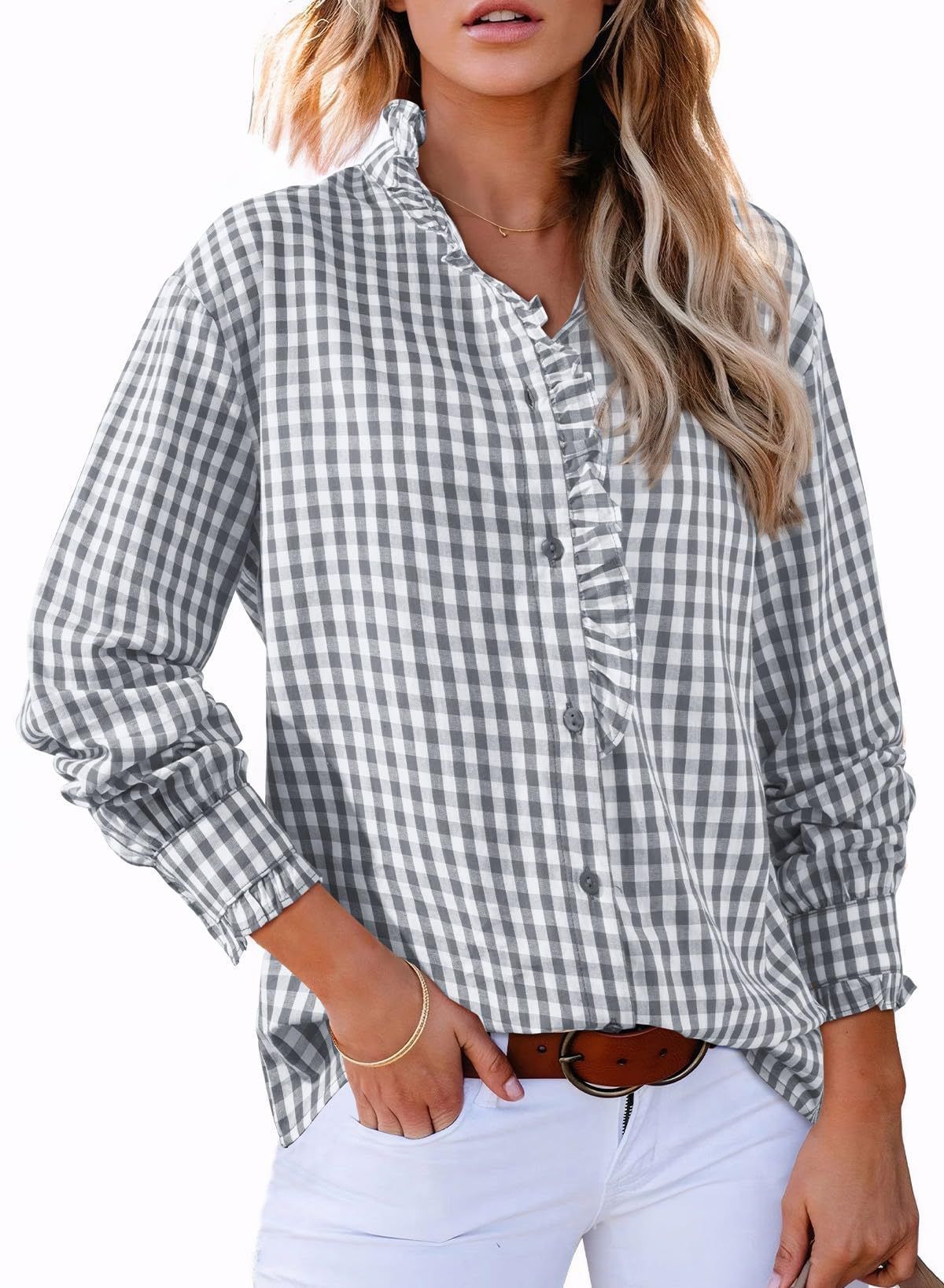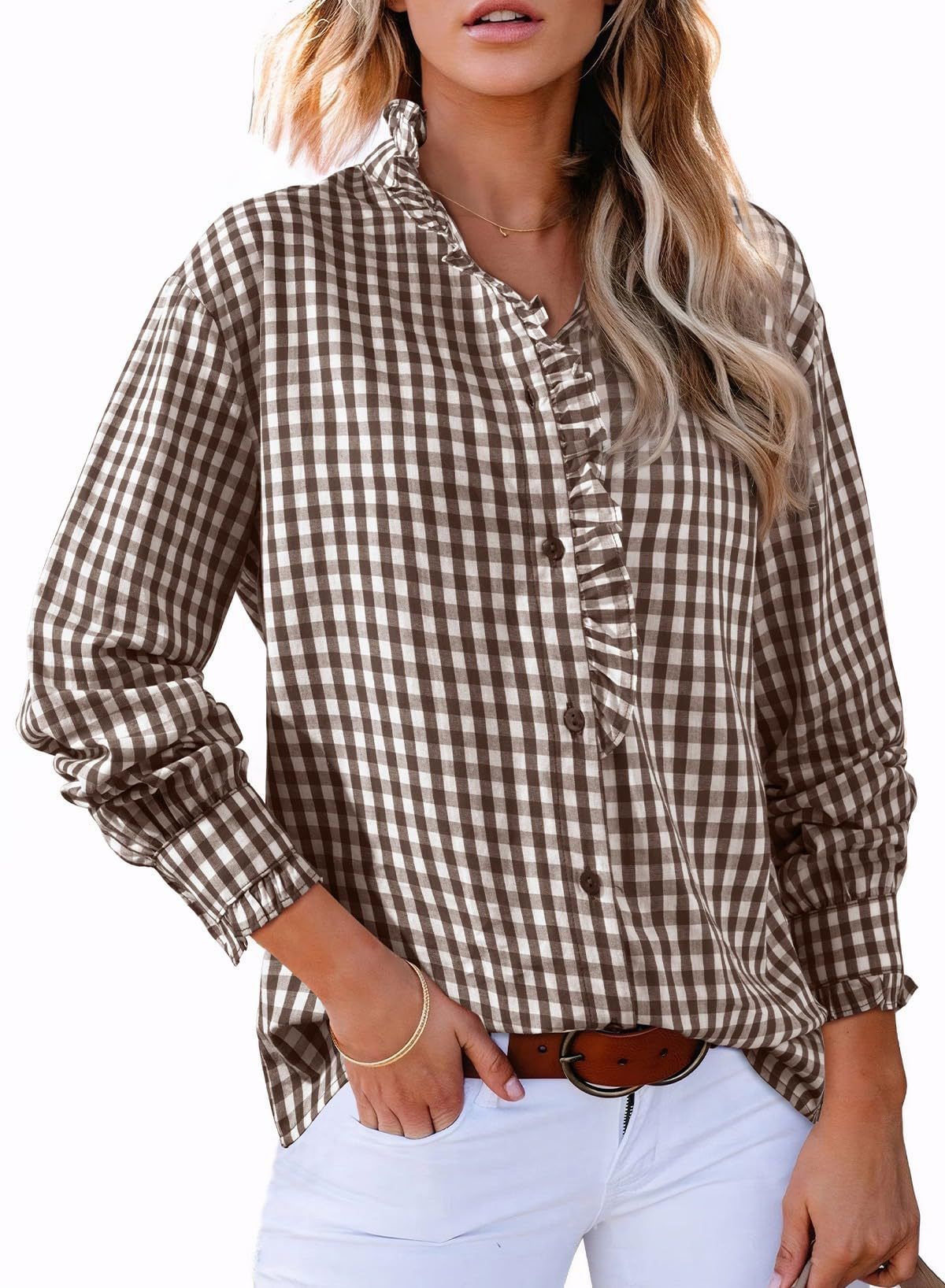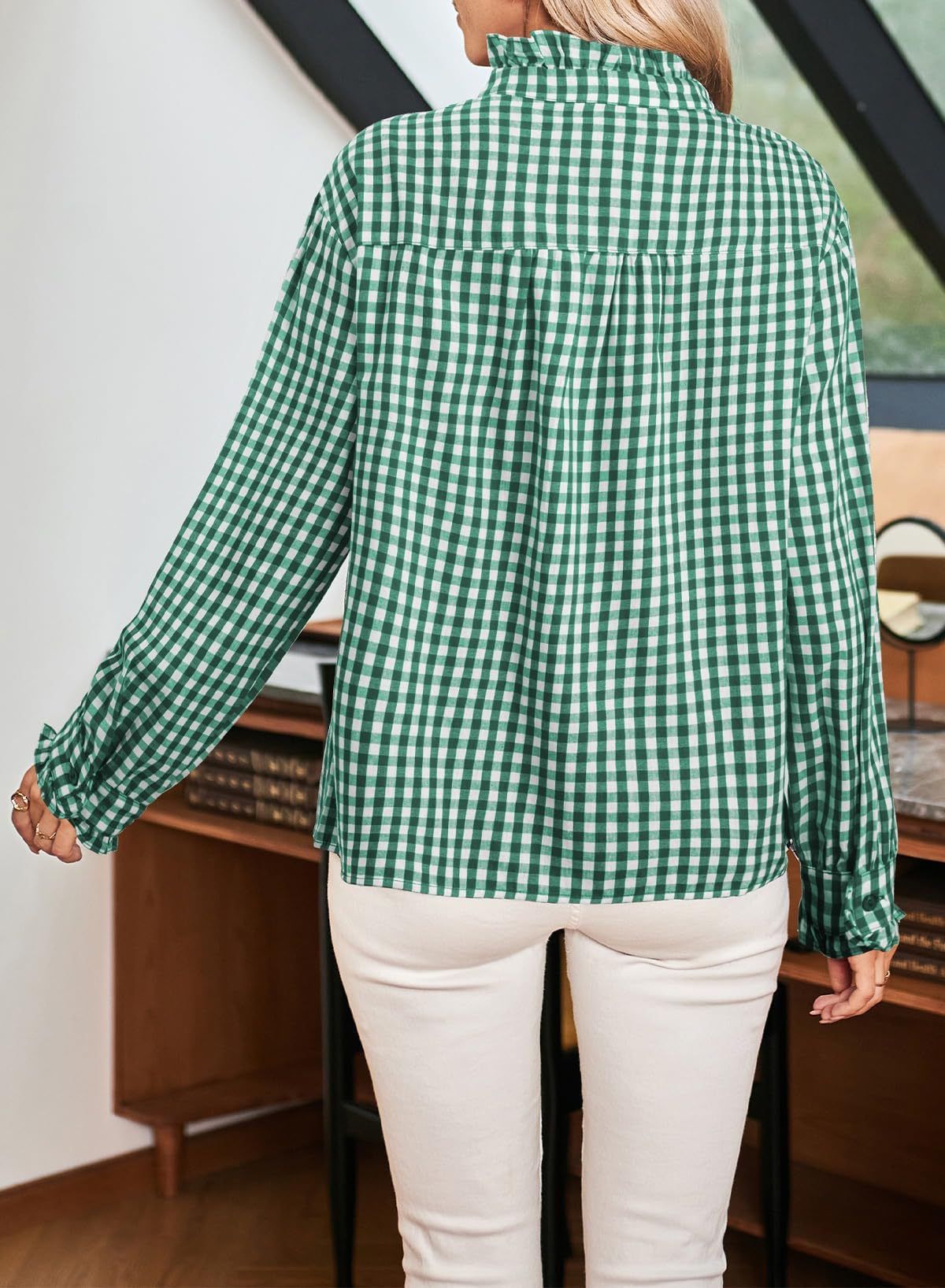 Plaid pleated V-neck shirt